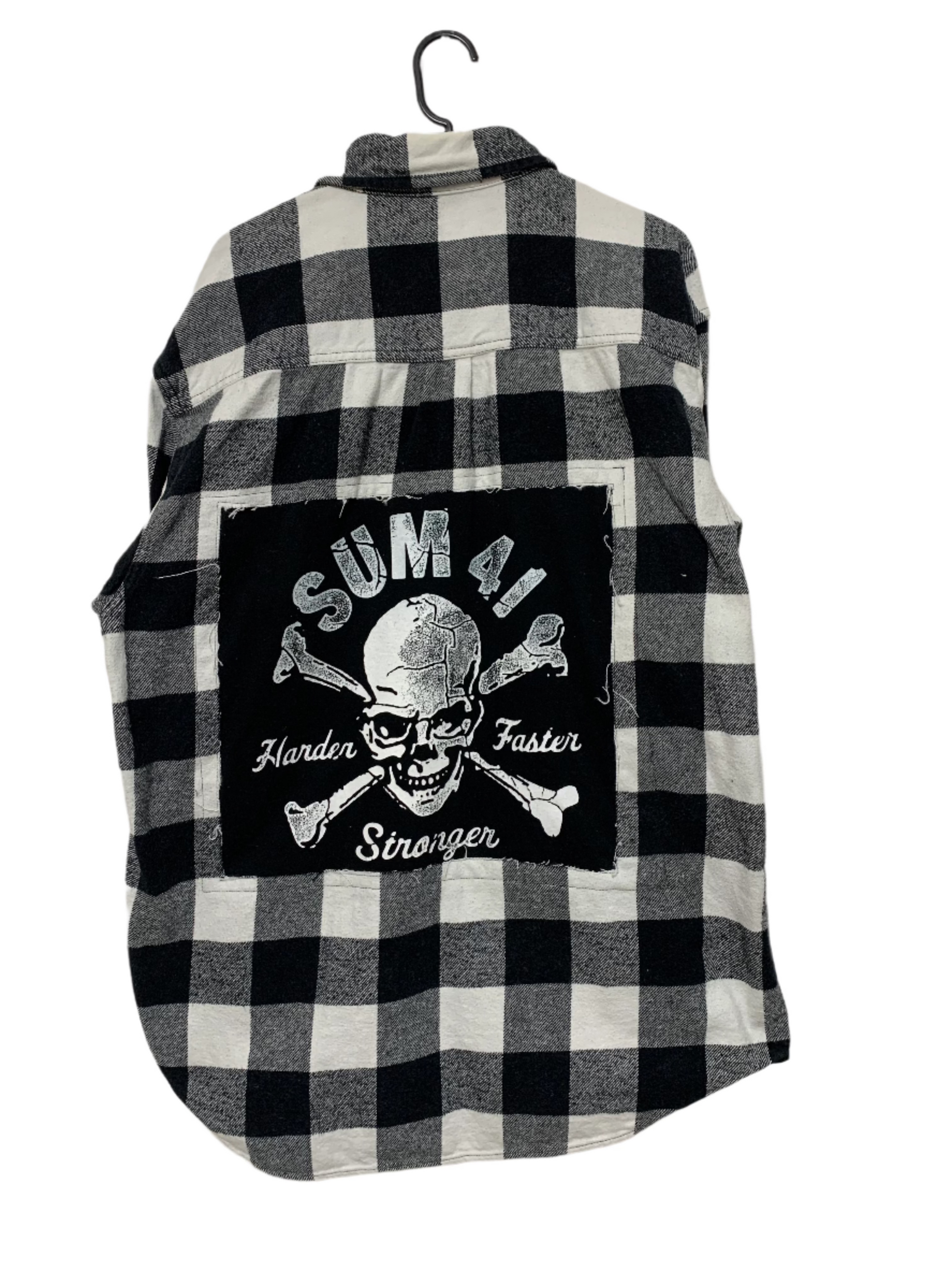Remade button down flannel shirt featuring a Sum 41 T-shirt window patch.